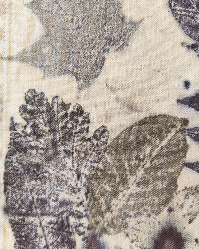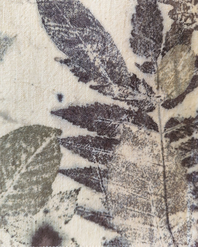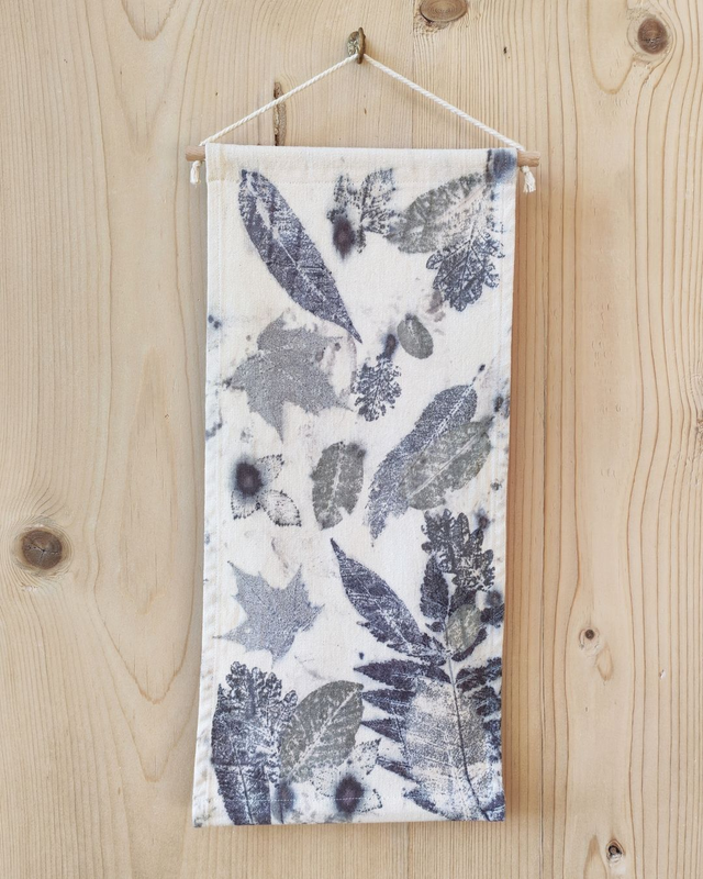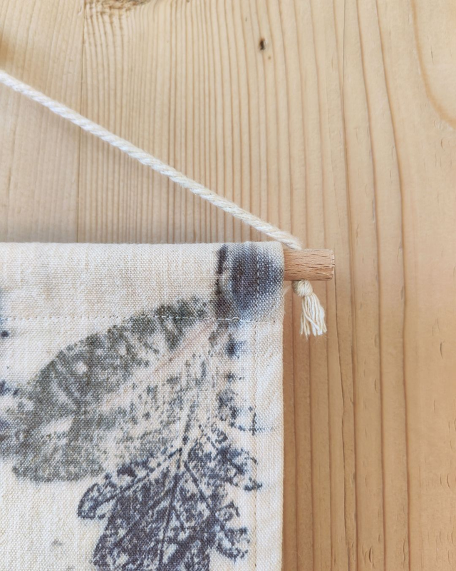 Ce kakémono a été imprimé artisanalement avec la technique de l'écoprint, qui consiste à recueillir directement sur le tissu l'empreinte de végétaux fraîchement cueillis.