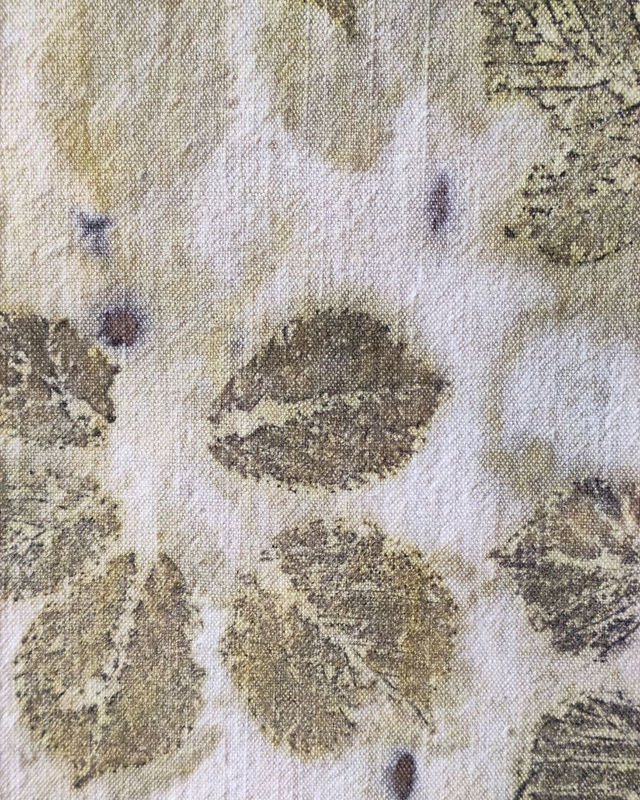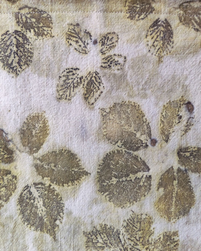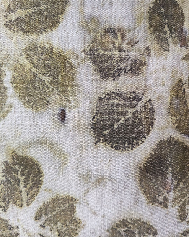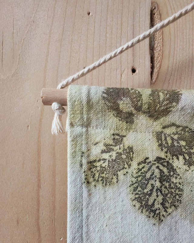 Ce kakémono a été imprimé artisanalement avec la technique de l'écoprint, qui consiste à recueillir directement sur le tissu l'empreinte de végétaux fraîchement cueillis.