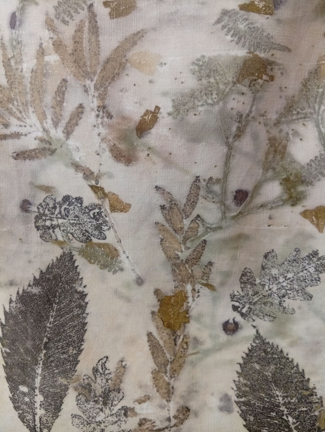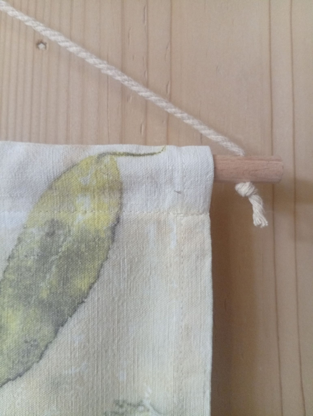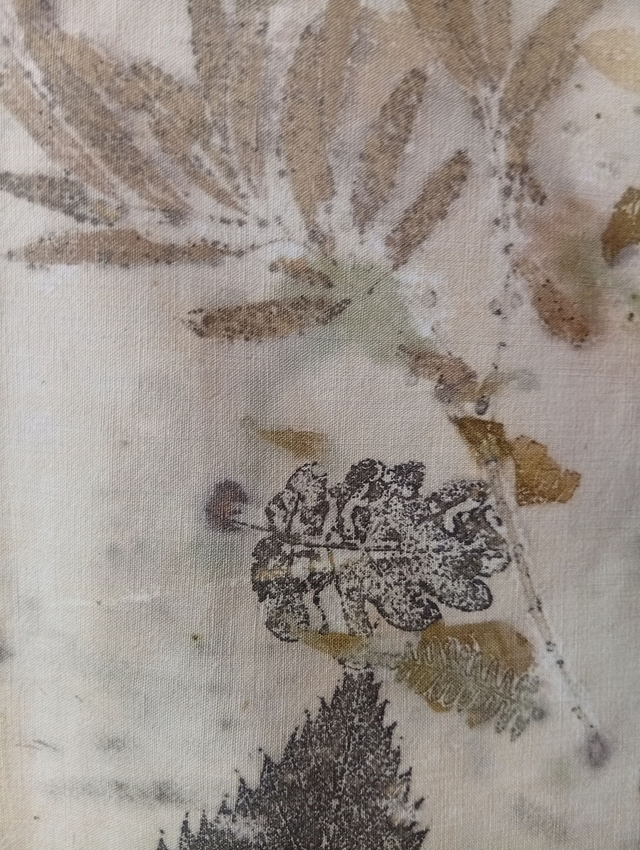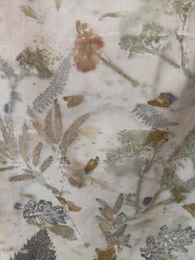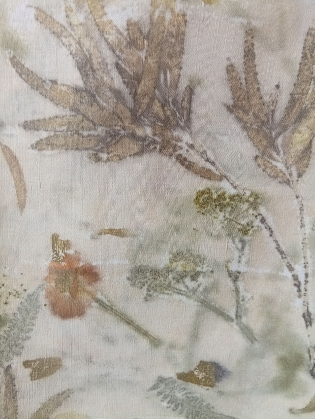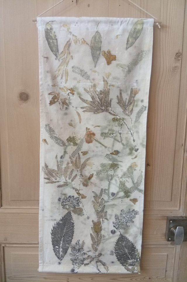 Ce kakémono a été imprimé artisanalement avec la technique de l'écoprint, qui consiste à recueillir directement sur le tissu l'empreinte de végétaux fraîchement cueillis.