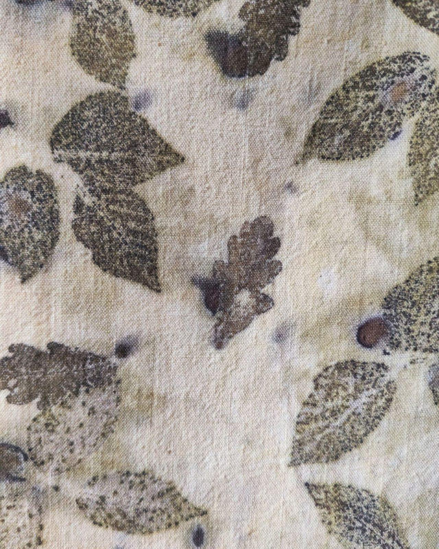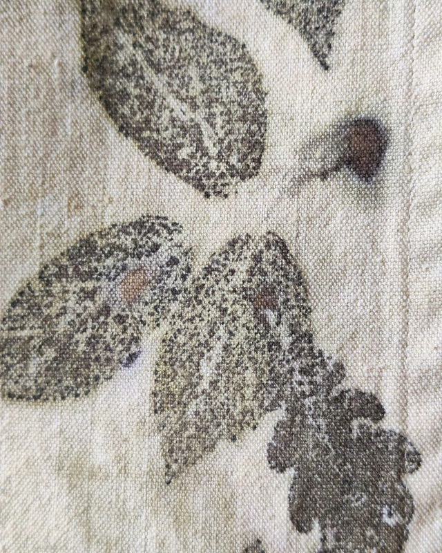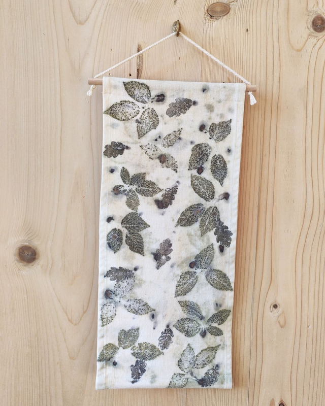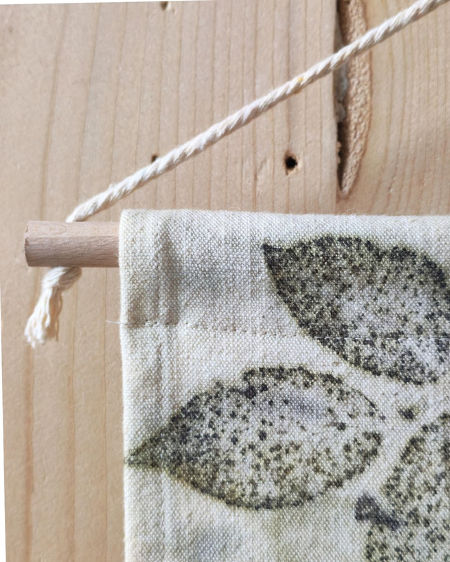Ce kakémono a été imprimé artisanalement avec la technique de l'écoprint, qui consiste à recueillir directement sur le tissu l'empreinte de végétaux fraîchement cueillis.